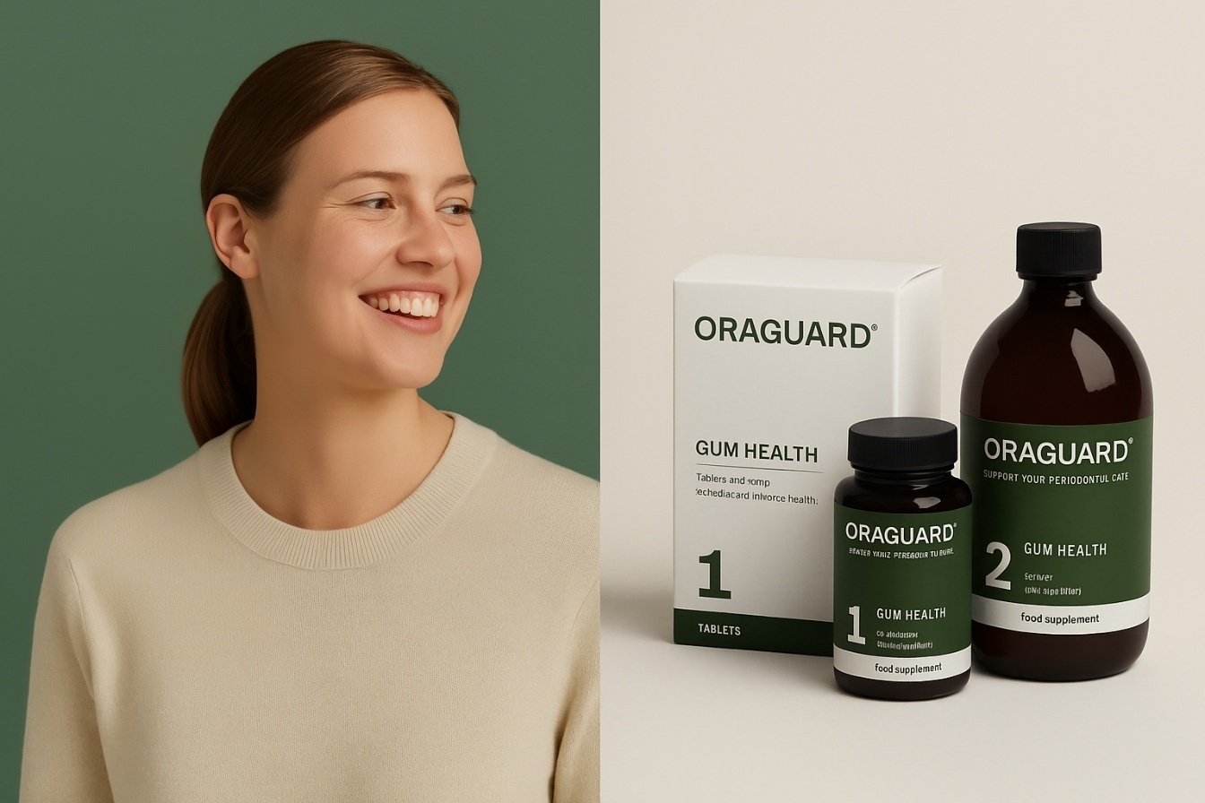 Oraguard Gum Health provides targeted nutritional support for healthy gums. Developed by periodontists, its unique formula helps strengthen natural defenses, supports recovery after professional treatment, and contributes to long-term gum wellness.