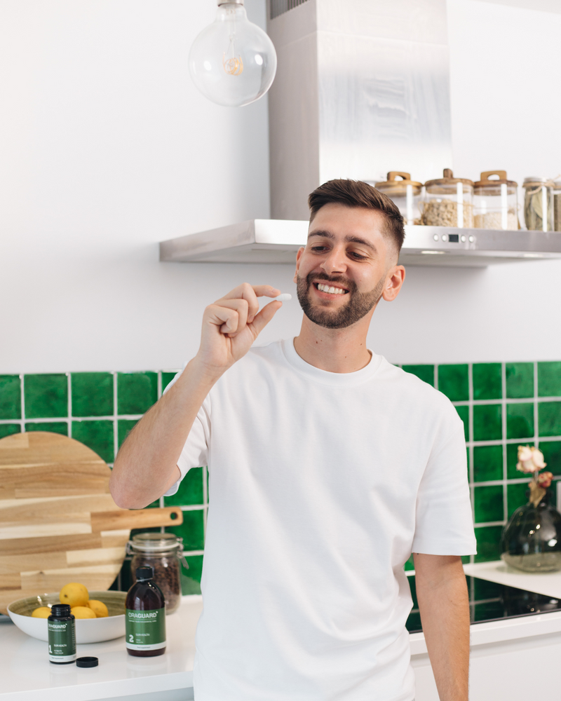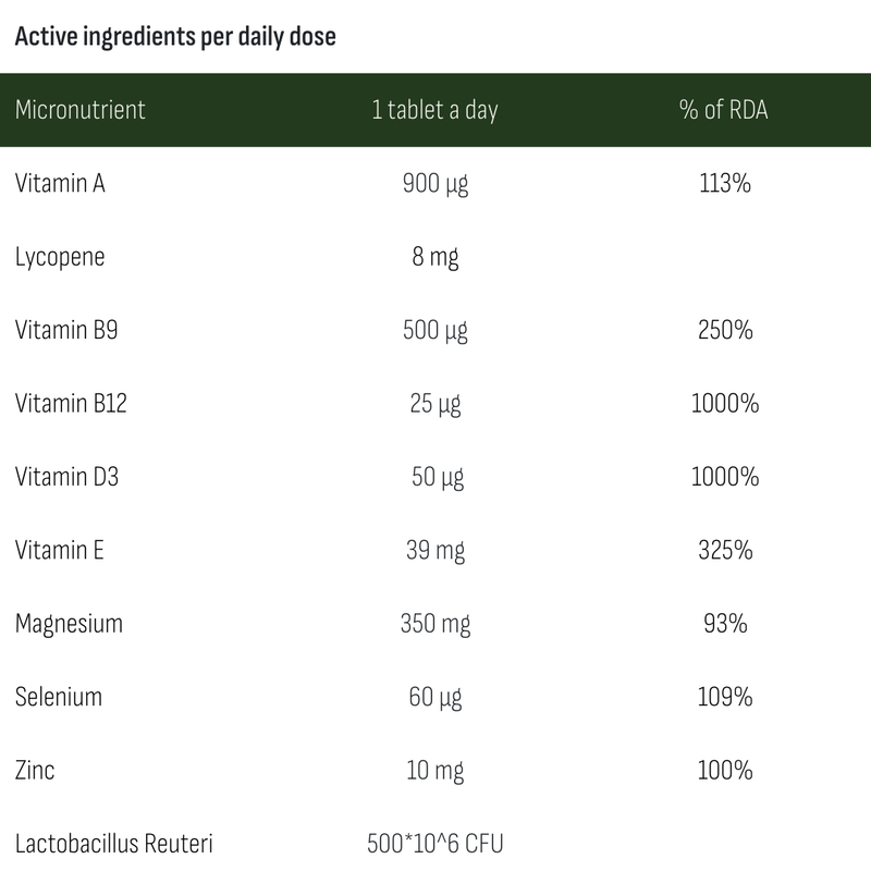 Dietary supplement with sweeteners. Ingredients per daily dose (1 tablet): Magnesium (magnesium hydroxide) 350mg (93% RDA*), Microcrystalline cellulose (filler), Lycopene 8mg, Vitamin E 39mg (325% RDA*), Zinc 10mg (100% RDA*), Selenium (Selenium-enriched yeast) 60µg (109% RDA*), Diglycerides of fatty acids (anti-caking agent), Vitamin A 900µg (113% RDA*), Lactobacillus reuteri 500 million CFU***, Vitamin D3 50µg (20001U**) (1000% RDA*), Silicon dioxide (anti-caking agent), Magnesium salts of fatty acids (anti-caking agent), Vitamin B9 500µg (250% RDA*), Vitamin B12 25µg (1000% RDA*).