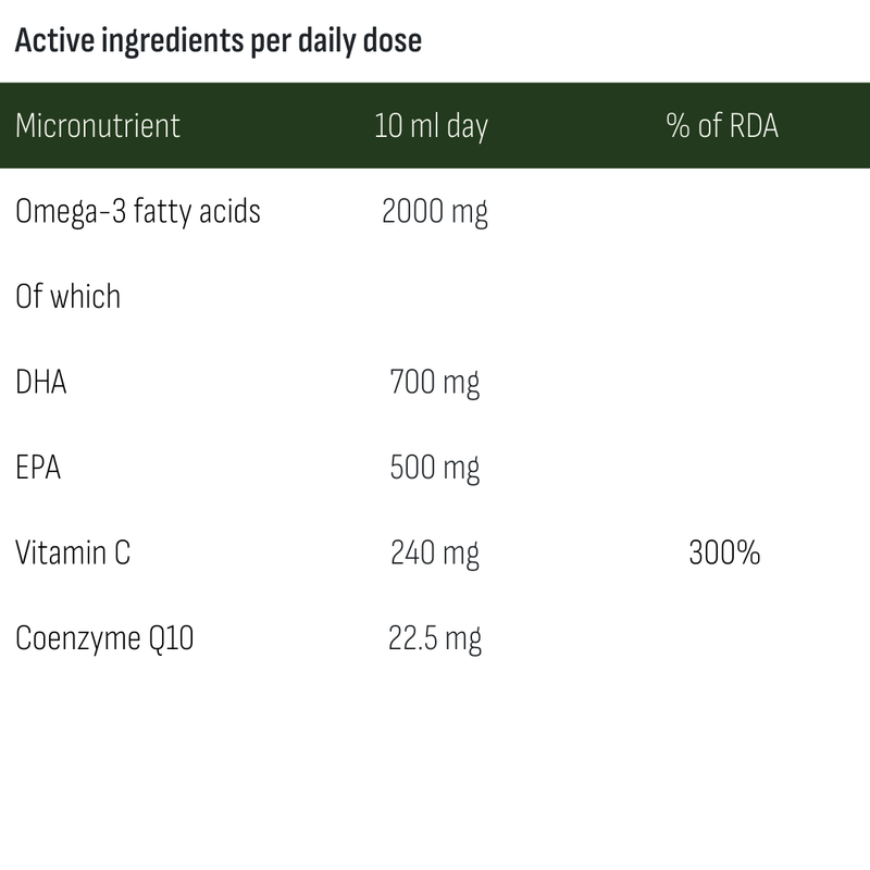 Dietary supplement with sweeteners. Ingredients per daily dose (10 ml syrup): Sorbitol syrup (sweetener), Omega-3 fatty acids 2000mg (contains EPA 700mg, DHA 500mg), Vitamin C 240mg (300% RDA*), Polysorbate 80 (emulsifier), Aroma, Coenzyme Q10 22.5mg.
